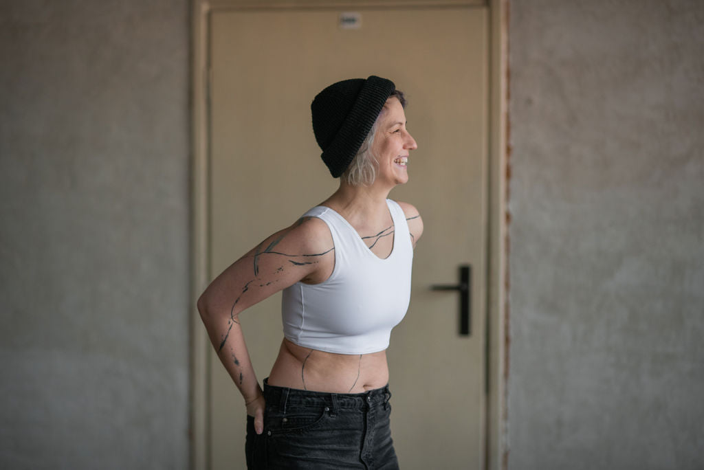Tight sports bra style top. Designed to flatten the chest, hide the...