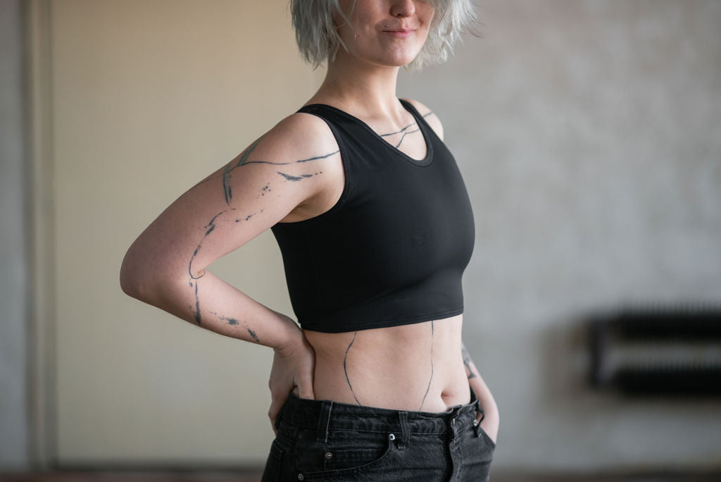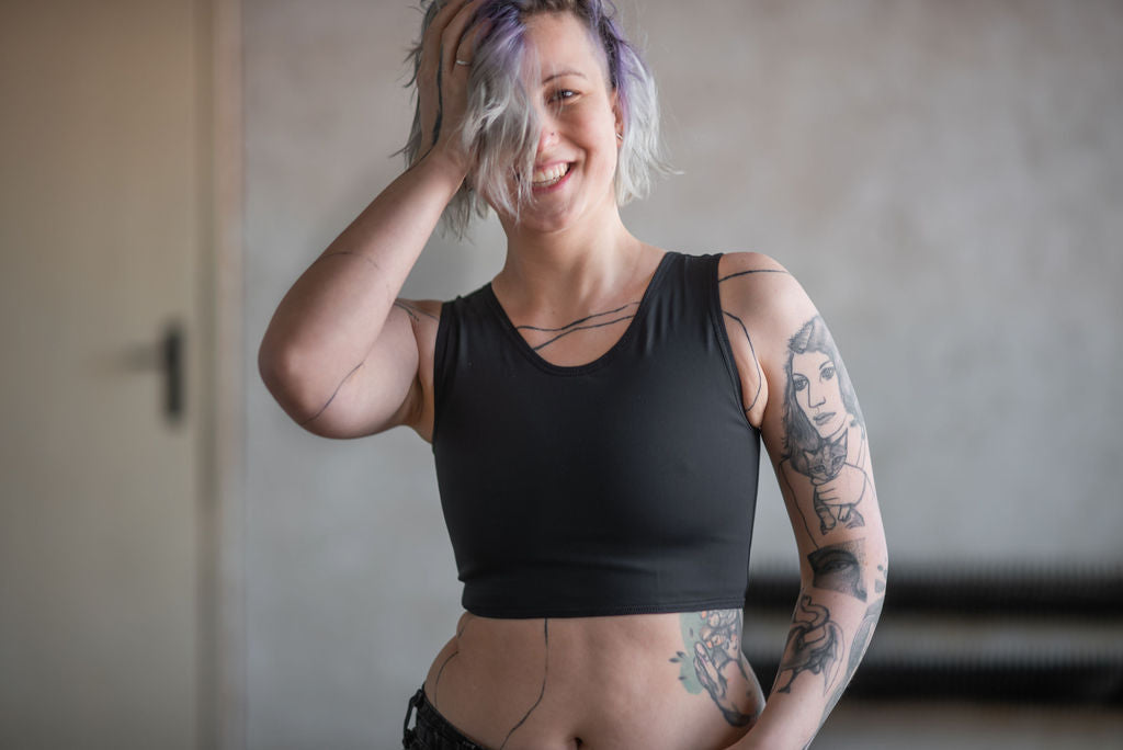 Krátká verze základního binderu v extra pevném provedení. Vhodný na každodenní nošení. Pevně drží a výrazně zplošťuje hrudník, proto může být trošičku náročnější jeho oblékání a vysvlékání. Průramky jsou střižené tak, aby nikde nic nevylézalo a vše bylo pěkně schované. Hlubší výstřih se schová i ve výstřihu do V.