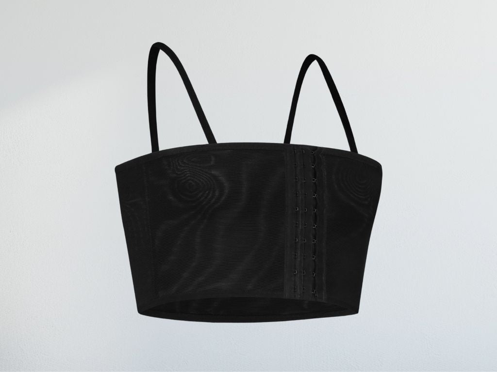 Navržený z prodyšné elastické síťoviny, která se hýbe s tělem a umožňuje přirozený pohyb žeber i dýchání. Má krátký střih, zapínání vpředu na háčky a volitelná ramínka – ta si snadno připnete nebo odepnete podle toho, co vám vyhovuje.